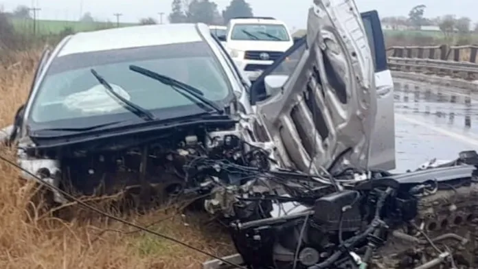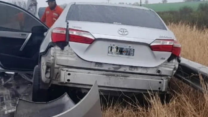 Un impactante accidente ocurrió este martes por la mañana en el kilómetro 41 de la Ruta 18, cerca del puente sobre el Arroyo Grande en Viale, durante un intenso temporal. Un Toyota Corolla quedó con su parte delantera completamente destrozada y el conductor fue derivado al hospital.